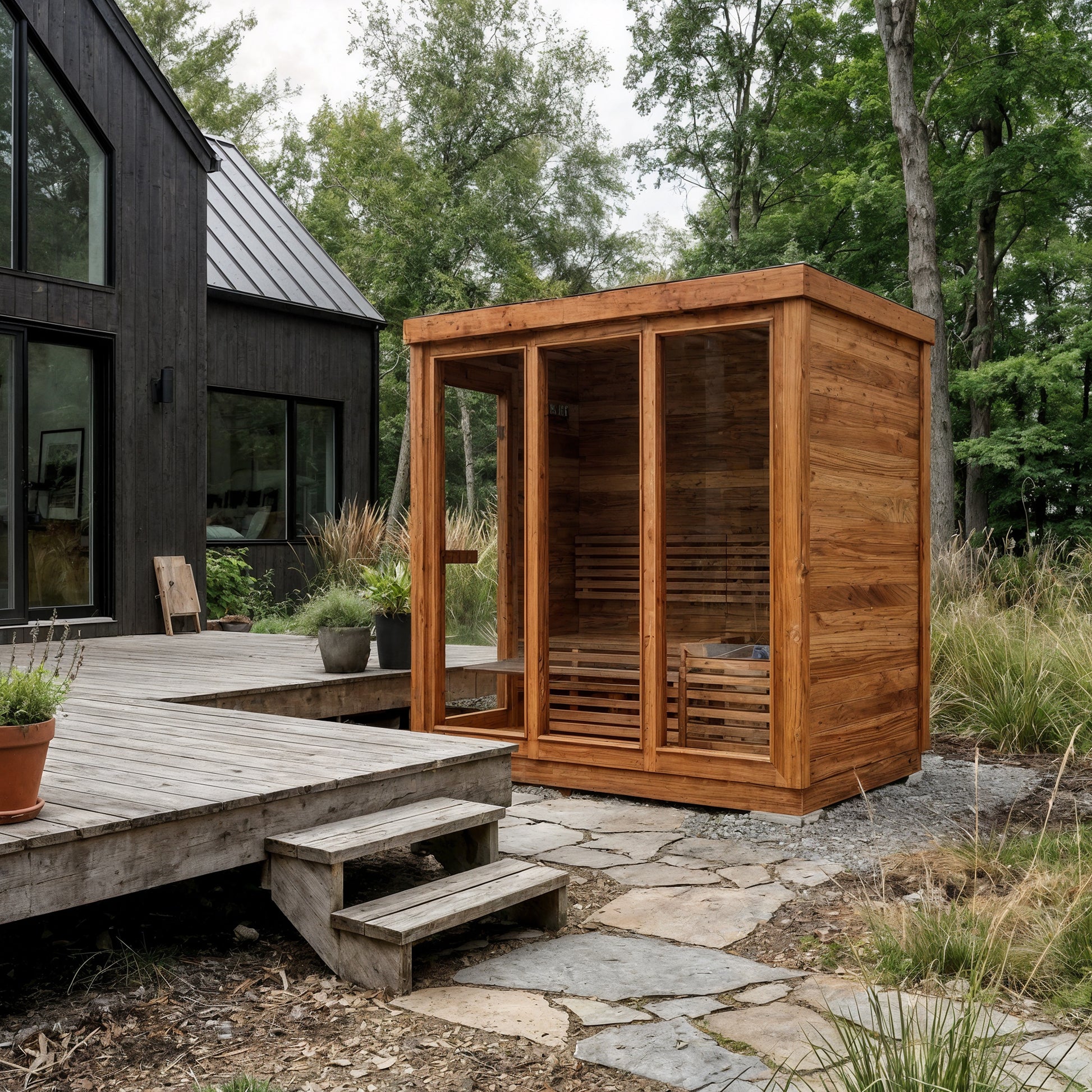 Modern Box Design: Sleek, contemporary sauna featuring three large front glass panels and a side-entry door for easy access and an open, modern feel.
