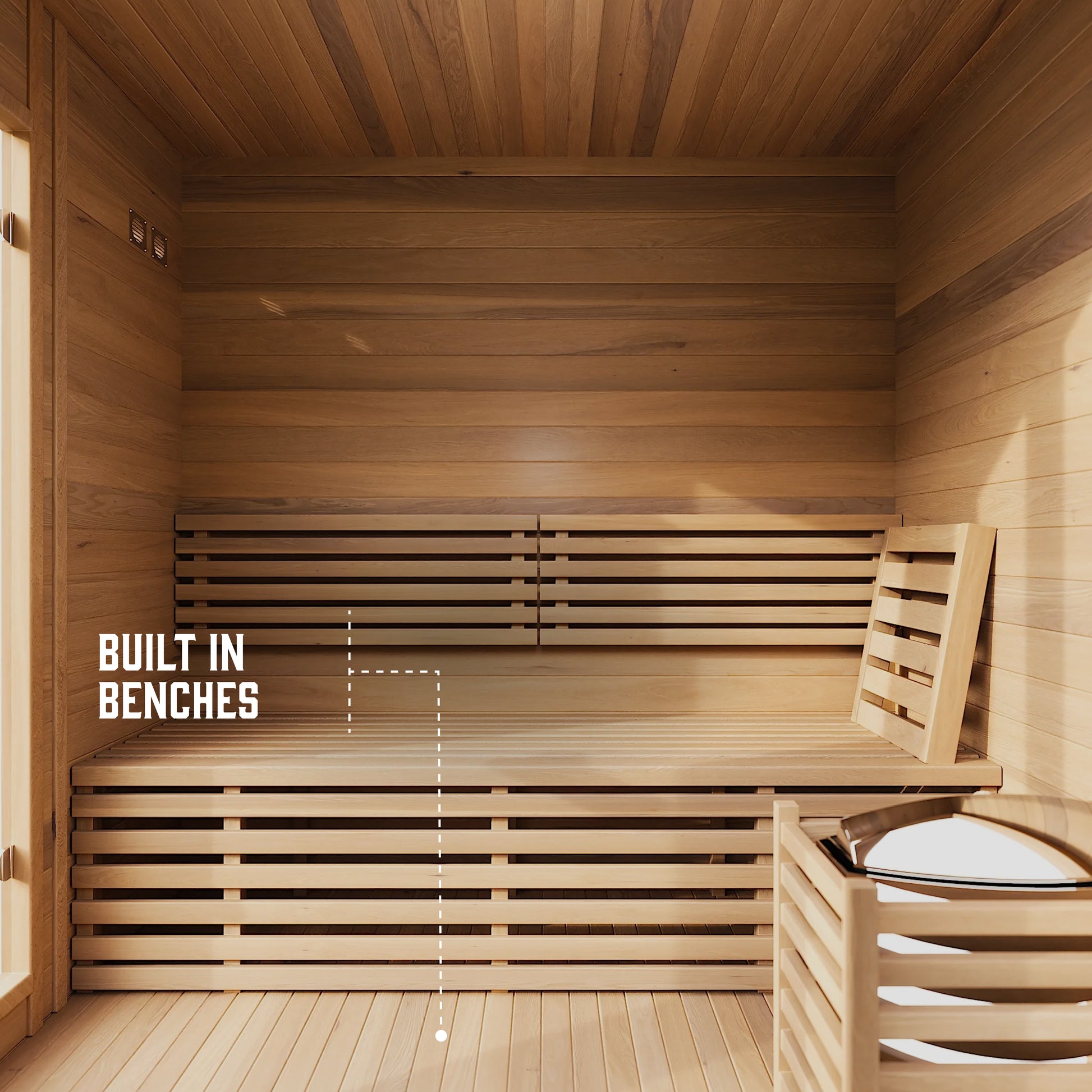 Comfort & Safety Focused: Includes an 18” wide bench, explosion-proof lighting, a heat-resistant wooden door handle, and a breathable air vent for fresh airflow.